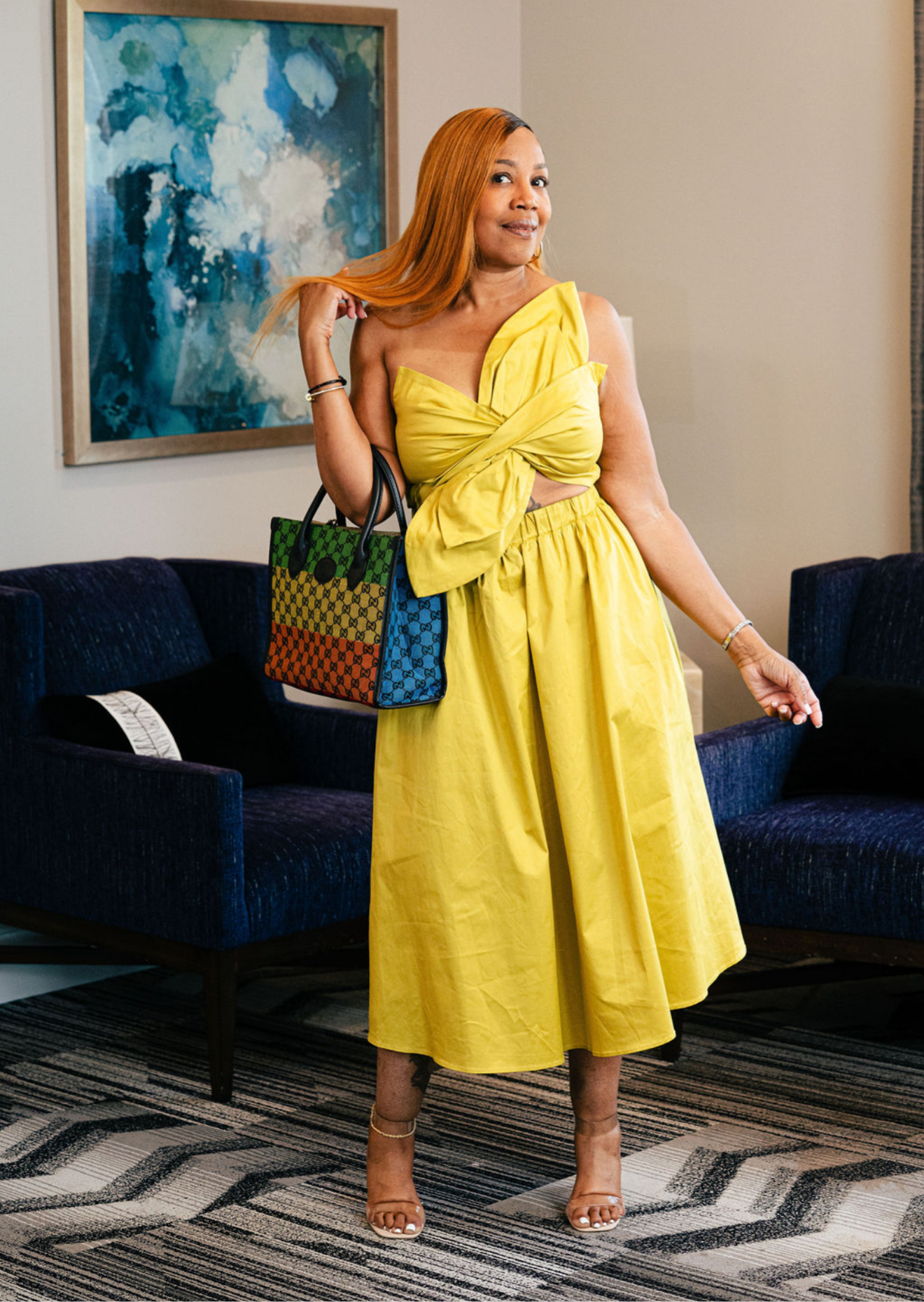 Knot twisted long dress in stretch twill fabric.The midi dress features an unique twisted and pleated bow at front bodice with one shoulder construction with adjustable strap, smocking at back, midi a line skirt with elasticated waist at back side pockets and cut out at front.