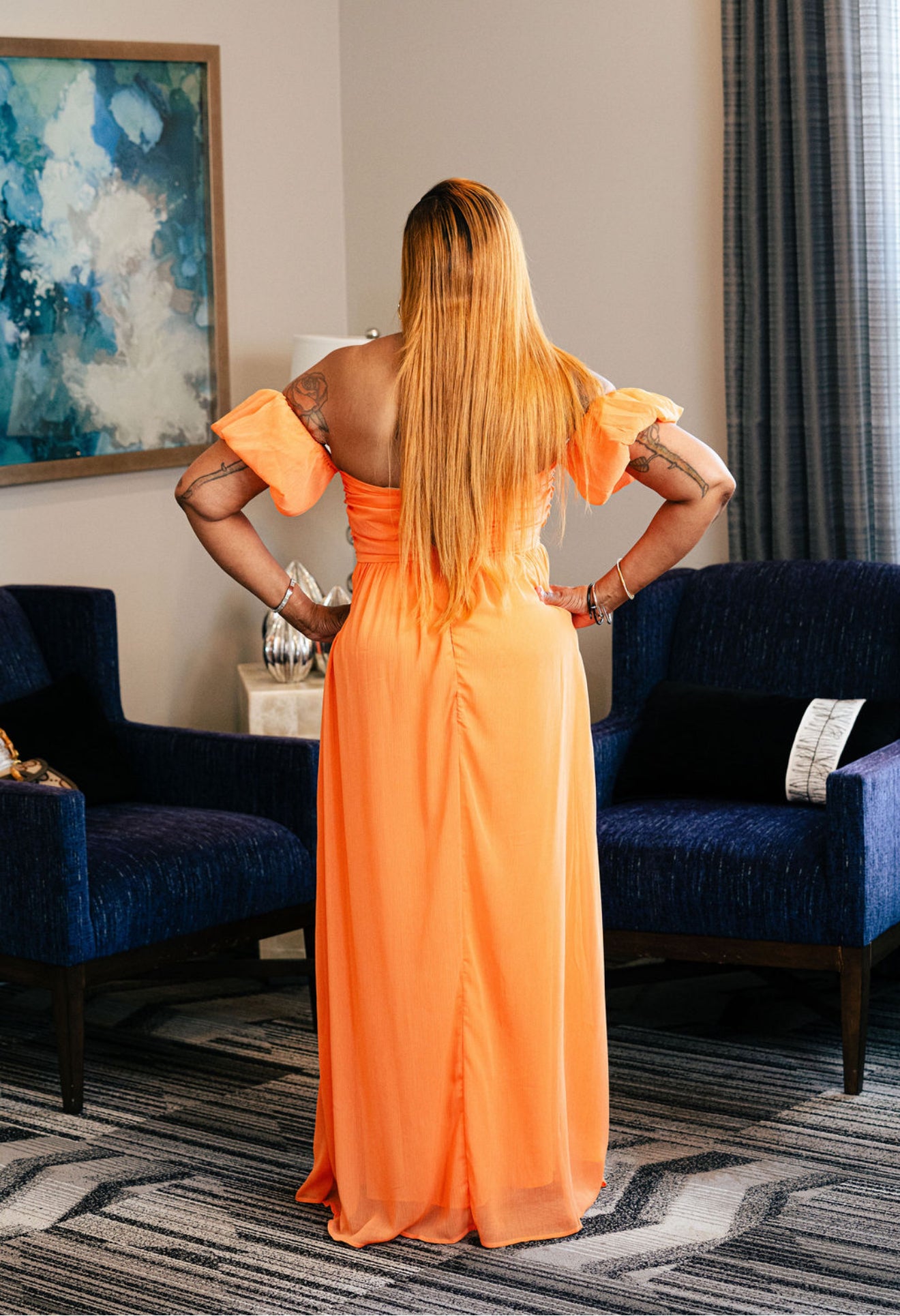 Ruched Chest Off Shoulder Chiffon Maxi Dress.The dress has a lining.