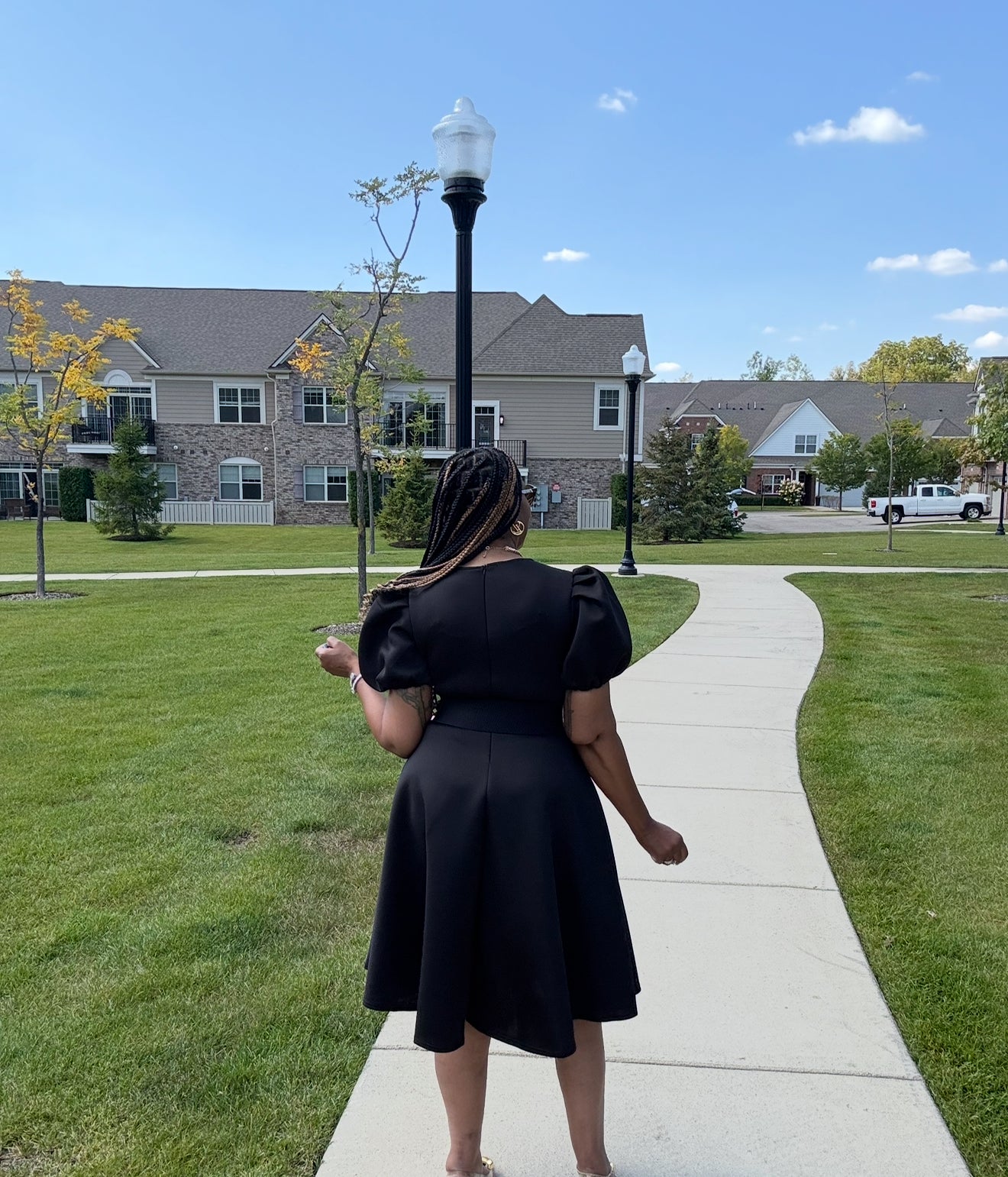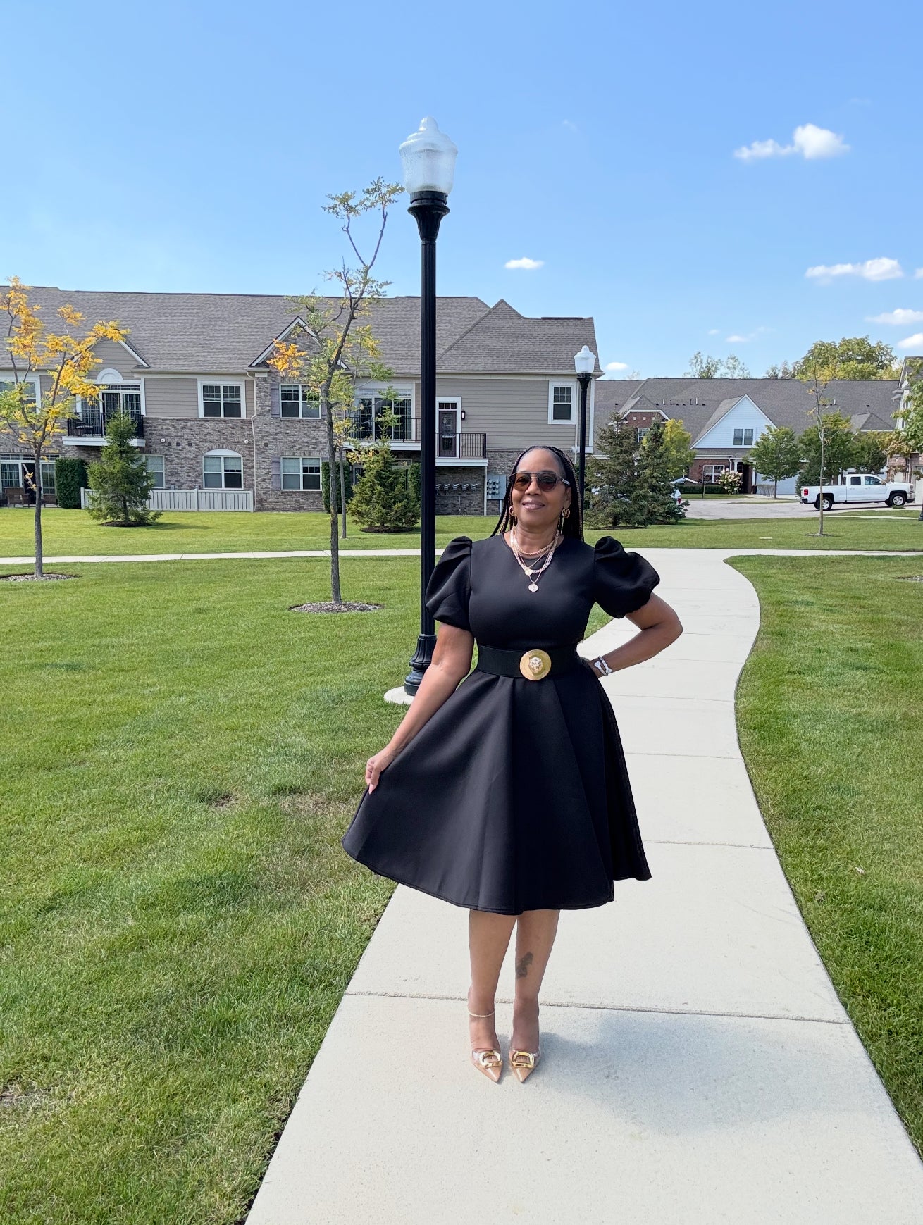 Crew neck puff sleeve dress.A-line with cinched waist 8% polyester 30% spandex Belt not included.